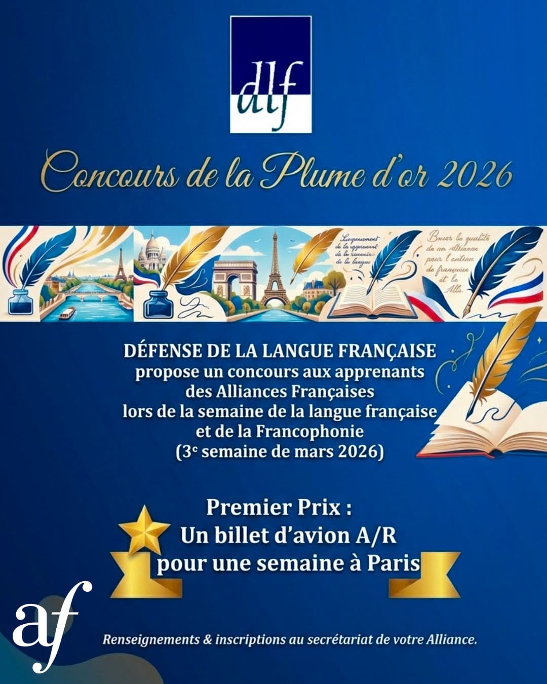 Dans le cadre de la fête de la Francophonie, en collaboration avec l’association Défense de la langue française, l’Alliance Française de Palma de Mallorca invite ses apprenants, ayant plus de 18 ans et au minimum un niveau A2, à participer au concours de la Plume d’Or.